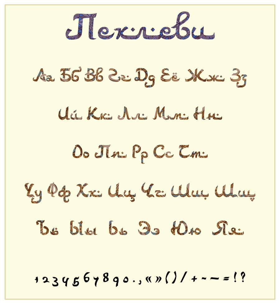 Пехлеви — русская, кириллическая версия шрифта Abu Dhabi, стилизованного под арабский алфавит.