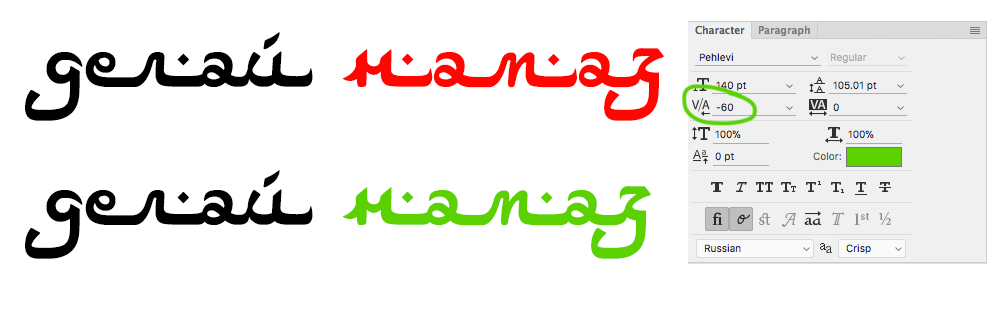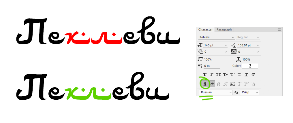 В шрифте предусмотрено множество лигатур. Для их активации выберите специальную опцию в окне Character программы Photoshop, а также укажите русский язык.