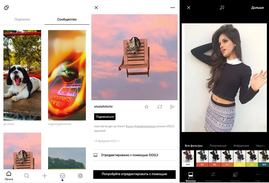 VSCO — удобный фоторедактор на Андроид, которое также включает в себя внутреннее сообщество с конкурсами и челленджами. Приложение входит во все рейтинги мобильных редакторов, так как отличается удобным управлением и большим набором профессиональных инструментов. В редакторе можно найти десятки фильтров для быстрой стилизации снимков и ручные настройки. Особенностью софта являются “рецепты”, то есть наборы готовых настроек, которые можно сохранять для дальнейшей работы. При просмотре фотографий других пользователей можно скопировать настройки, что значительно ускоряет процесс обработки.