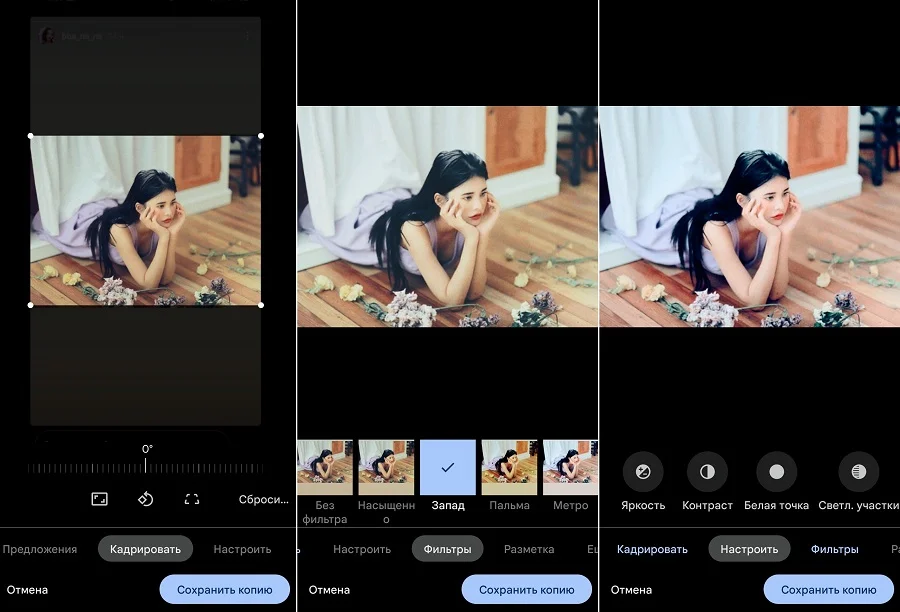 то здесь можно провести базовые работы (обрезка, настройка яркости и экспозиции), улучшить картинку фильтрами, добавить надписи.