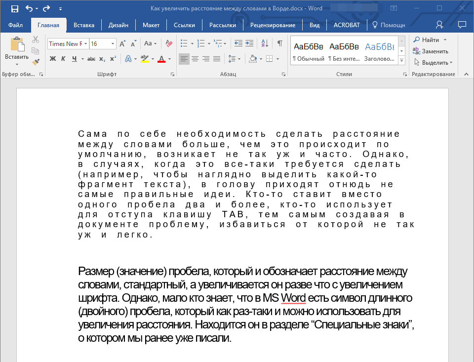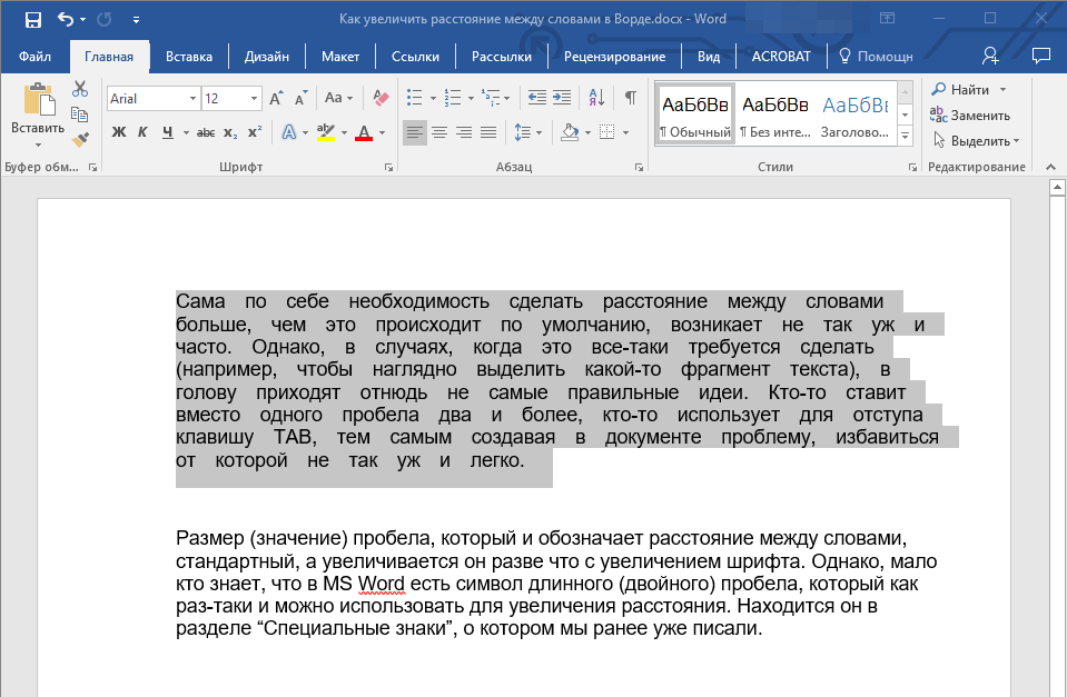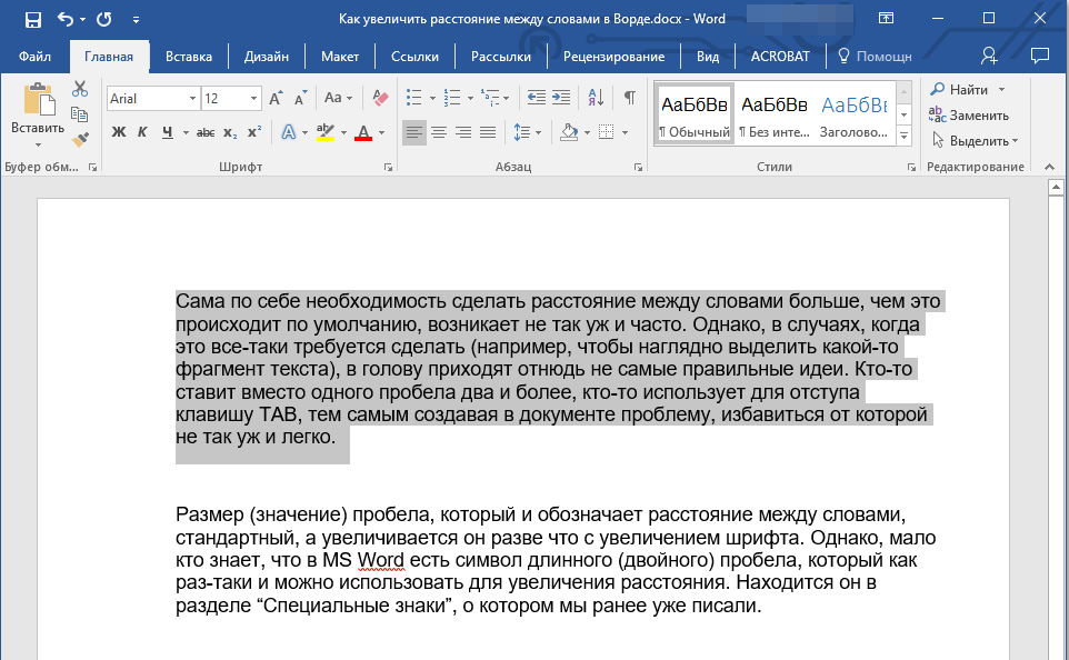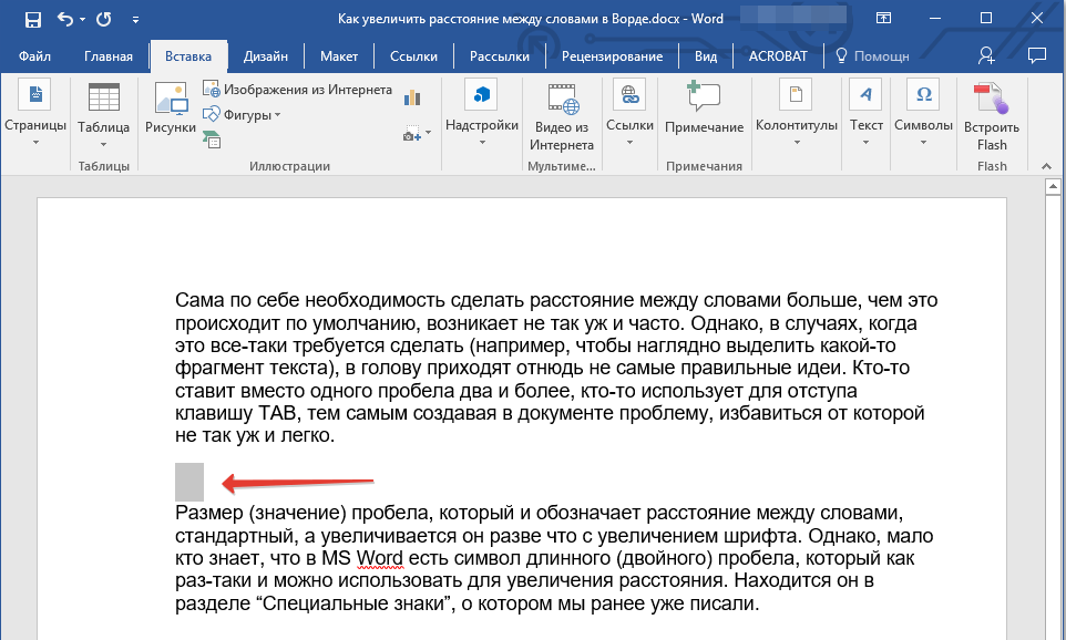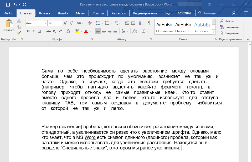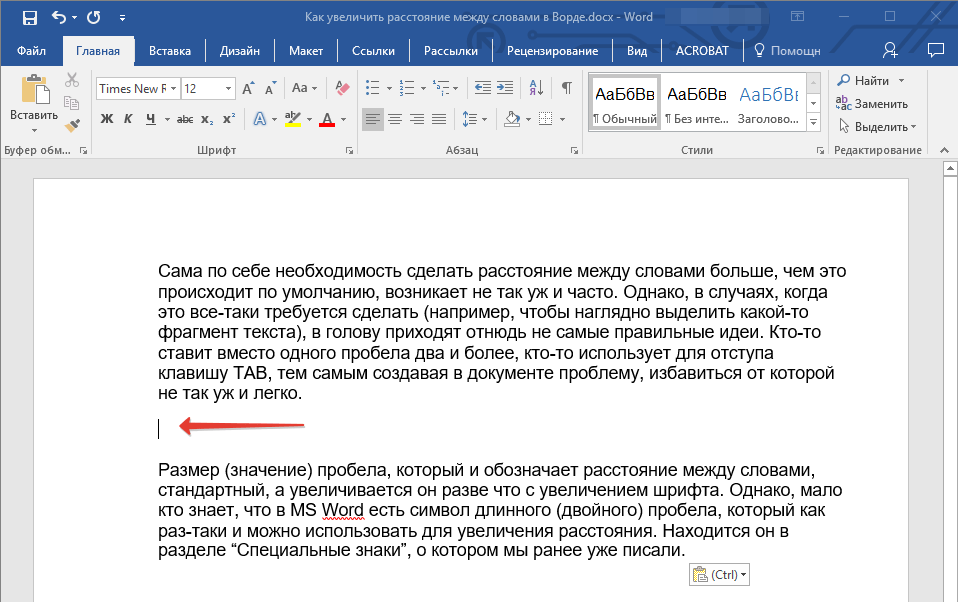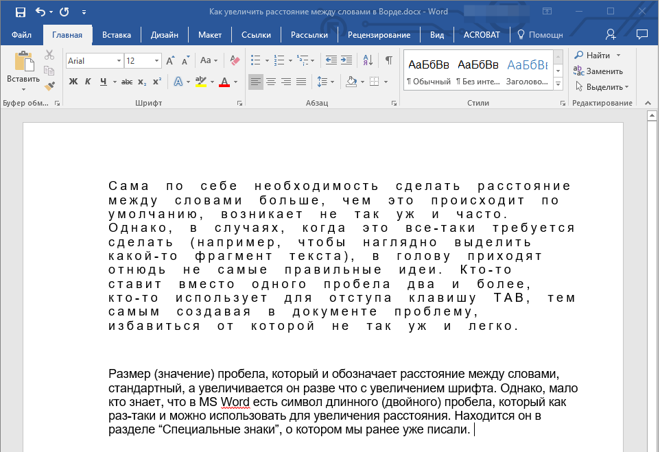 Итак, единственно верное решение, которое можно принять в случае необходимости увеличить или уменьшить расстояние между словами, это замена обычных пробелов на длинные или короткие, а также ¼ пробела. О том, как это сделать, мы расскажем ниже.