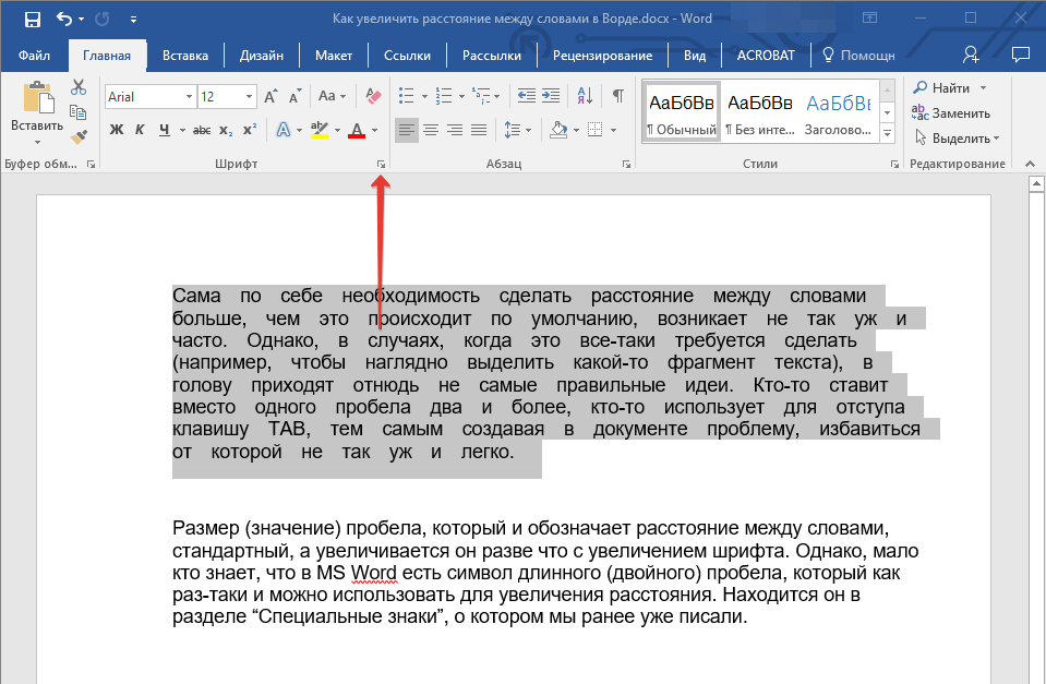 Уже здесь мы могли бы закончить, если бы не одно “но”: помимо увеличения или уменьшения интервала между словами в Ворде, также можно изменить и расстояние между буквами, сделав его меньшим или большим в сравнение со значениями по умолчанию. Как это сделать? Просто выполните следующие действия: