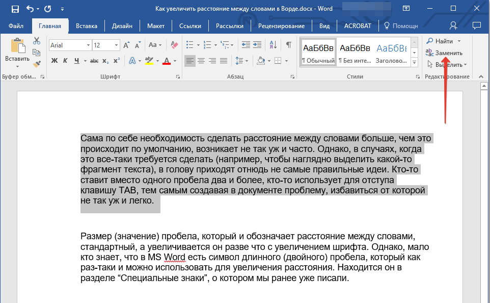 Как вы, наверное, понимаете, вручную заменять все обычные пробелы на длинные или короткие в тексте или отдельном его фрагменте не имеет ни малейшего смысла. Благо, вместо затяжного процесса “копировать-вставить”, сделать это можно с помощью инструмента “Замена”, о котором ранее мы уже писали.