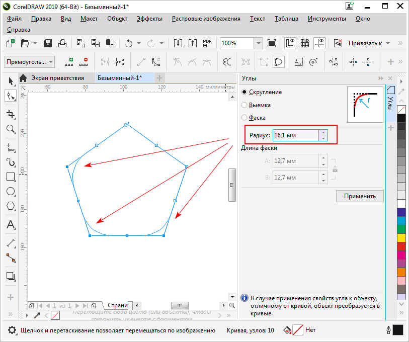 Как закруглить углы у прямоугольника в кореле? Очень просто! Кликаем по инструменту «Форма» и перетаскиваем маркер на углу ближе к центру. Углы скругляются или скашиваются в зависимости от ваших настроек.